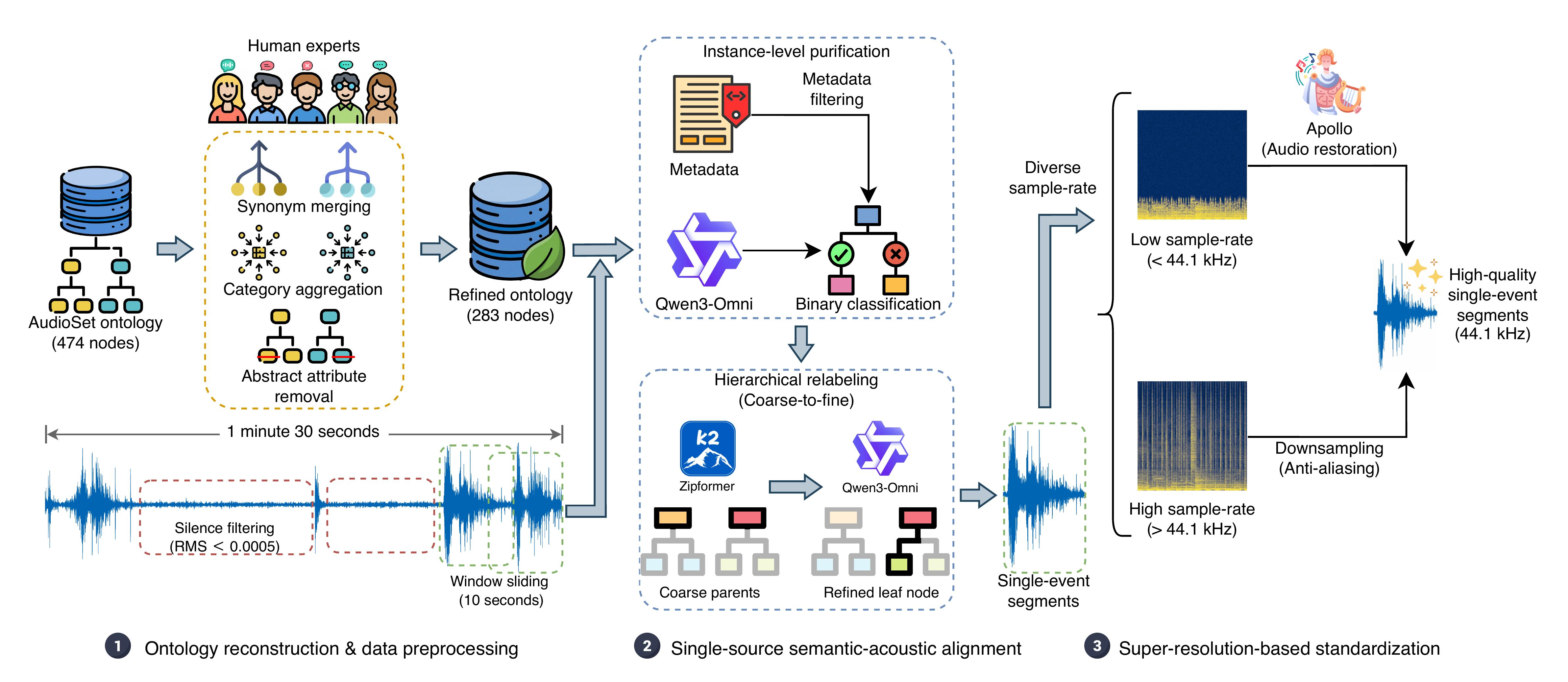 | Query-based universal sound separation is fundamental to intelligent auditory systems, aiming to isolate specific sources from unconstrained mixtures. Despite recent advances, existing methods continue to suffer from residual interference in complex acoustic scenes. This performance limitation stems largely from a data bottleneck: ubiquitous in-the-wild datasets contain weak labels and severe event co-occurrence. These flaws induce models to learn spurious correlations between background noise and target categories instead of robust acoustic features. To address this, we propose an automated pipeline that eliminates co-occurrence noise by mining high-purity single-event segments from unconstrained recordings and synthesizing mixtures via semantically consistent strategies. Utilizing this pipeline, we constructed Hive, a high-quality synthetic dataset comprising 2k hours of audio. Experimental results demonstrate that, despite using only ~0.2% of the data scale of million-hour baselines, models trained on Hive achieve competitive separation accuracy and perceptual quality. Moreover, these models exhibit remarkable zero-shot generalization on out-of-distribution evaluation benchmarks such as MUSDB18-HQ and USS-Bench. These findings highlight that prioritizing supervision purity enables significant data efficiency, offering a new paradigm for training robust auditory foundation models with reduced computational costs. |
